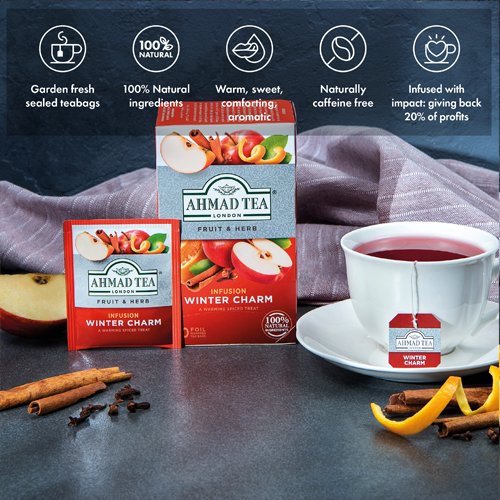 Каждый пакетик помещен в отдельную фольгированную упаковку, чтобы сохранить все ароматы. Это значит, что вы сможете побаловать себя чашечкой вкусного травяного чая «Зимнее очарование», куда бы вы ни отправились в новогодние праздники. Восхитительно благоухая, с пряными и фруктовыми нотками, он непременно успокоит и подарит чувство комфорта еще до того, как вы сделаете глоток. Этот напиток особенно хорош, если смаковать его, закутавшись в плед. Он также не содержит кофеина, поэтому вы можете выпить чашечку этого чая, чтобы согреться и расслабиться перед сном.